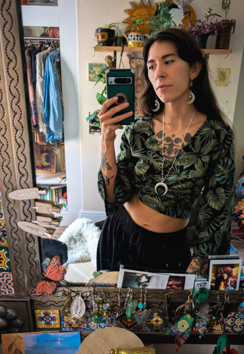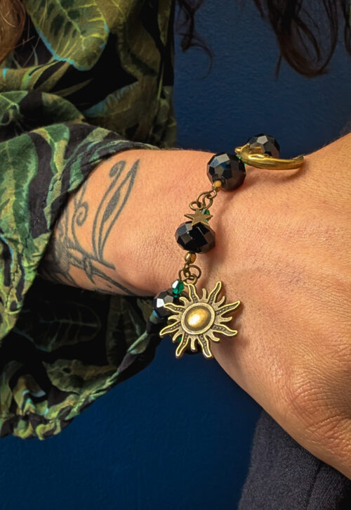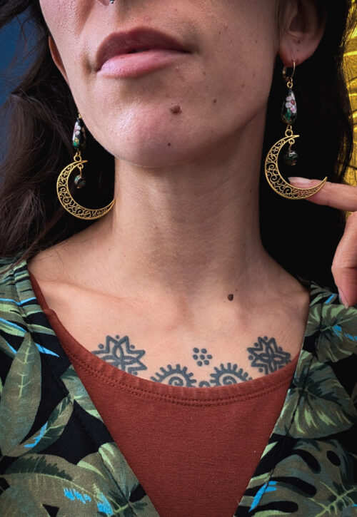 This is a limited edition, upcycled line. A pair of whimsical, filigree crescent moon earrings. Warm gold in colour with deadstock vintage cloisonne beads. Set on lever back hoops for a more contemporary, fancy feel. Approximately 30% recycled materials. Scroll down for our other jewels and styling ideas. Material: Costume metal, gemstone. Size: 2.5"/6.4cm long excluding hooks Weight: 8g per pair -