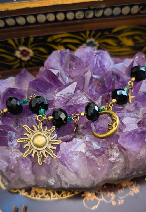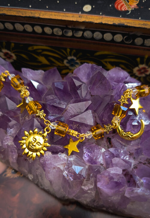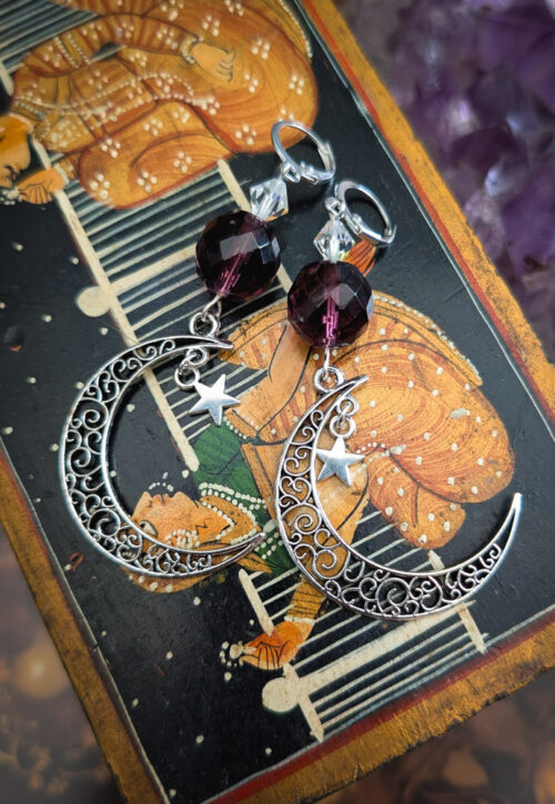 This is a limited edition, upcycled line. A pair of whimsical, filigree crescent moon earrings. Bright silver in colour with vintage crystal and recycled purple faceted glass. Set on lever back hoops for a more contemporary, fancy feel. Approximately 30% recycled materials. Scroll down for our other jewels and styling ideas. Material: Costume metal, gemstone. Size: 2.5"/6.4cm long excluding hooks Weight: 12g per pair -
