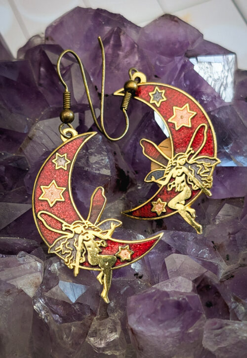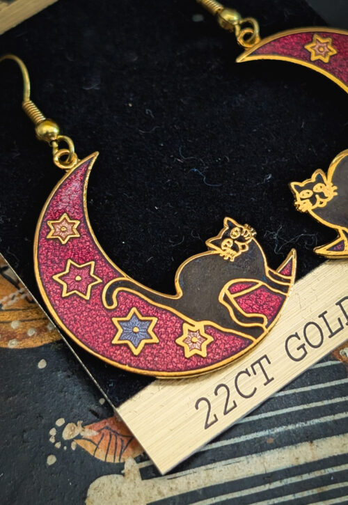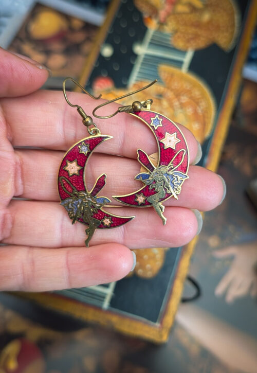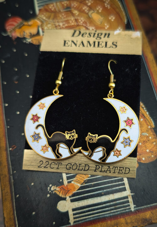 A one-off pair of gorgeous vintage enamelled crescent moon earrings with a sitting fairy. Perfectly whimsical! Cloisonne is always a popular choice and sought-after at the moment. Material: Costume metal, enamel Size: 1.5" / 3.75cm excluding hooks Weight: Lightweight Please note although we do our best to check, all vintage may show minor signs of wear. -