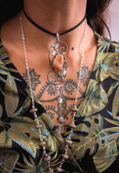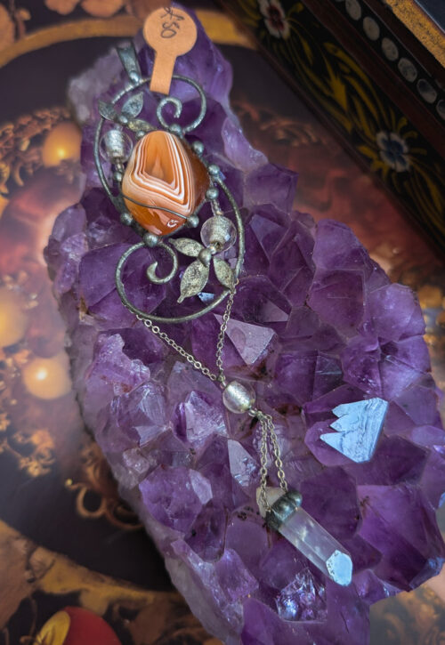 Beautiful handamde fairy (not by us, this is preloved). A centrepiece of orange agate with floreal / leaf and swirl patterns in oxidised silver metal, glass beads and a clear quartz dangle. This is such a statement making piece. The bale is large enough to thread your own chain; we've included a long piece of black faux-suede so you can wear it at whatever length you choose. Material: Costume metal, glass, crystal Size: 6" / 15cm long Please note although we do our best to check, all vintage may show minor signs of wear. -