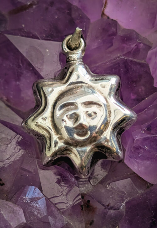 Beautiful handamde fairy (not by us, this is preloved). A spiral centrepiece with dangling raw quartz and purple smooth beads. We've included a long piece of black faux-suede so you can wear it at whatever length you choose. Material: Costume metal, glass, crystal Size: 6" / 15cm long Please note although we do our best to check, all vintage may show minor signs of wear. -