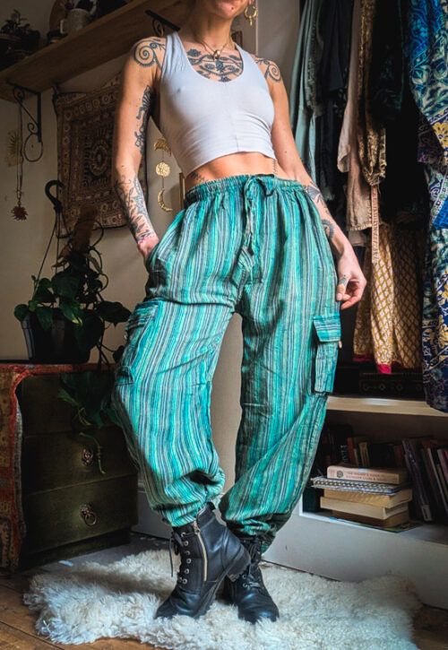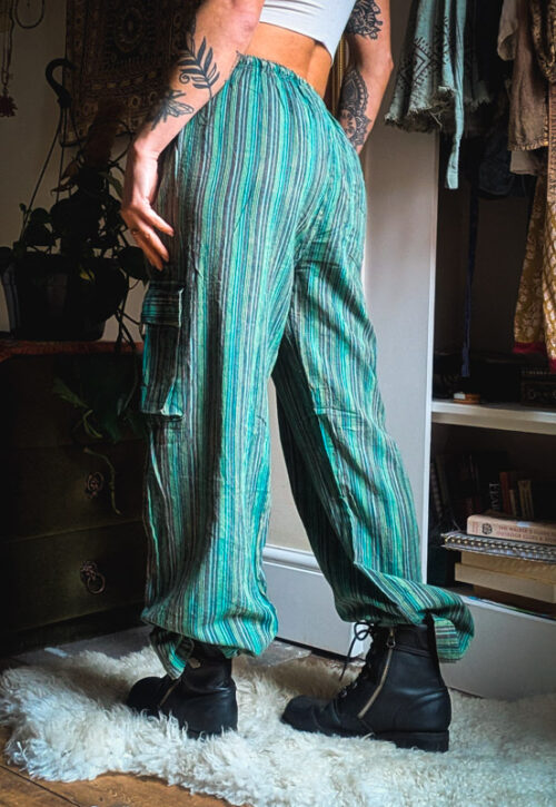 Say hello to your forever favourite trousers. Unisex comfy fit with elasticated waist, side, back and cargo pockets and a straight leg which looks cool rolled up. We love how versatile these are, we've worn them for nights out, lazy days in and even as pj bottoms! Fairly traded from Nepal. As these are not mass produced there can be small colour variations. Material: Lightweight cotton Size: S/M-XXL. Choose the sizes to bring up measurements. Sarah is 5'4 UK10 wearing the L which are a relaxed fit, sitting lower on the waist Care: Hand wash, do not tumble dry -