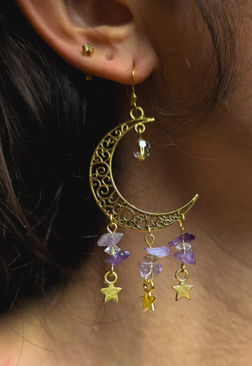 This is a limited edition, upcycled line. A pair of whimsical, filigree crescent moon earrings. Bright gold in colour with preloved amethyst chips and vintage crystal beads. Approximately 40% recycled materials. Scroll down for our other jewels and styling ideas. Material: Costume metal, gemstone. Size: 2.5"/6.4cm long excluding hooks Weight: 12g per pair -