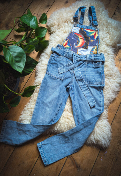 This is a one off vintage item and can't be restocked Washed black denim jacket with classic boxy fit and button up front. Reworked on the back with a wonderful patchwork of celestial fabrics, all preloved and collected over many years. The whimsical 90s feel has been enhanced with some lines of embroidery all over in the perfect celestial yellow. Please note although we do our best to check, all vintage may show minor signs of wear. Material: Cotton denim, cotton + polycotton celestial designs. Size: UK16 . Click the size in the box to see measurements. Sarah is 5'4 UK8-10 and it's an oversized fit -
