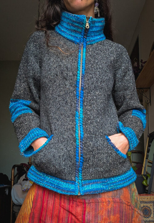This is a one off vintage item and can't be restocked Classic bohemian winter knit, made in Ecuador from chunky but lightweight wool. Charcoal grey melange with a soft blue patterned trim on the sleeves, neck and hem. Zip-up with a high funnel neck and two small front pockets. Please note although we do our best to check, all vintage may show minor signs of wear. Material: 100% wool Size: S.ML . Click the size in the box to see measurements. Sarah is 5'4 UK8-10 and it's a lovely fit -