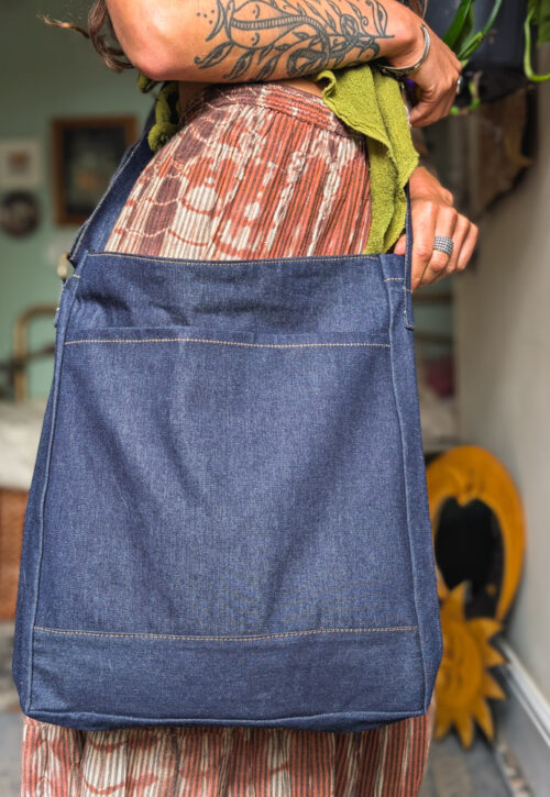 This is a one-off, reworked item and can't be restocked Deadstock messenger bag in a dark denim blue with adjustable strap, velcro inner fastening, back zip pocket and spacious inside compartment. Reworked with 100% reclaimed materials for us dreamers who like to be sustainable. Material: Cotton denim Size: 12 x 15 x 2" / 30 x 37.5 x 5cm excluding strap. -