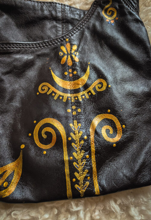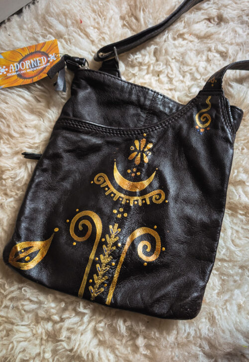 This is a one-off, reworked item and can't be restocked Cute deep chocolate brown leather handbag reworked with a tribal celestial design, inspired by ancient Minion artwork and Indian tattoos. Coated with a varnish to keep it rain-proof. The strap on this is adjustable so you can wear it long or short. Material: Leather -