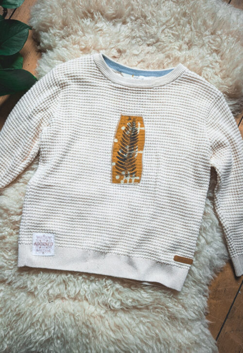 Preloved off-white waffle texture jumper, reworked with a fern patch printed on eco-friendly fabric. Machine washable at 30C or less following simple care instructions. Material: Cotton Size: 2-3 years Please note although we do our best to check, there may be minor signs of wear present on all our preloved pieces. -
