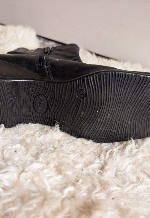 This is a one-off, reworked item and can't be restocked Thrifted (but unworn) pair of black slouchy boots from Clarks (RRP £90). Reworked with a metallic sun and moon design for a quirky and whimsical feel. The paintwork is coated to protect it against rain but isn't scuff-proof, so do take care and tread daintily! Material: Leather, rubber sole Size: UK6 / EU39 / US8 -
