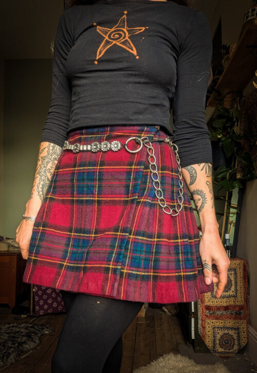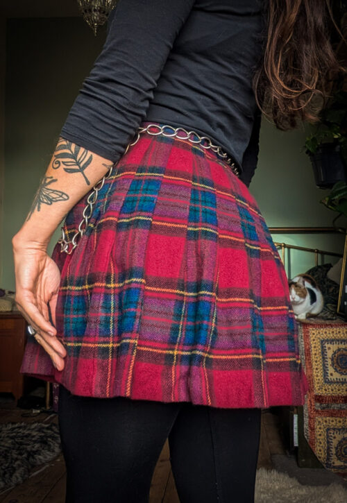 This is a one-off vintage item. We cannot restock the same one, as much as we'd love to! Cute little vintage tartan wool skirt. Perfect for autumn and winter looks. Fastens with two buttons on the waist, wrap-style Scroll down for related items and styling ideas from our shop. Material: Wool Size: XS, choose the size for measurements Sarah is 5'4 UK8-10 and it's a tiny bit snug on the waist -
