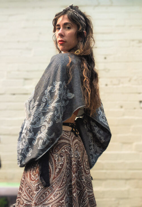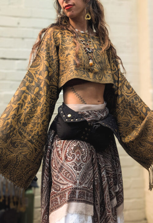 This is a one-off piece and can't be restocked We love scarves, but often find we have too many. So what do you do? You turn them into a long sleeved crop top. This has a very cropped middle, super long arms and relaxed fit. These are best for short torsos / petite frames or layer with a vest underneath. Just one bit of the neckline that frayed so has been zigzag stitched. Material: Viscose Size: One size. Sarah is 5'5/165cm UK10 and it's an oversized fit Can be machine washed on a cool temperature (30C or less) to keep it looking its best. Please note although we do our best to check, there may be minor signs of wear present on all our preloved pieces. -