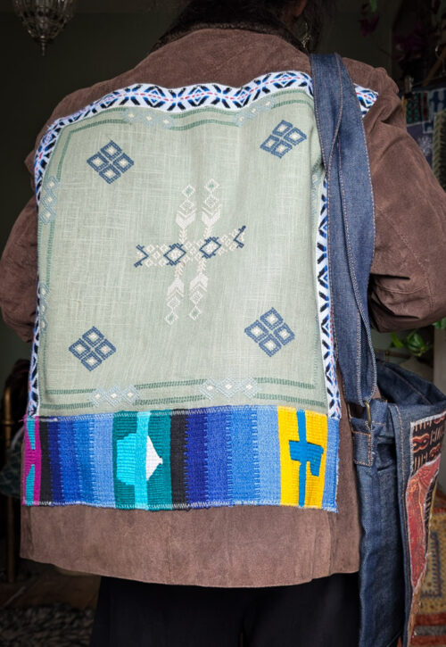 This is a one-off, reworked item and can't be restocked Perfect autumnal piece. Vintage real suede jacket with a slightly quilted lining and a faux-fur collar. All the fabrics on the back are reclaimed or vintage, gathered together over many years. The centrepiece is an old needlepoint cushion cover, bordered with 1970s wool trim and a hand woven Guatalmalen colourful belt on the bottom. Can be machine washed at 30C or less following simple care instructions, see card in your order. Material: Suede, synthetic lining Size: Labelled UK16 but comes up smaller. Click the size below to bring up measurements. Sarah is 5'4 UK8-10 and it's a relaxed fit. Please note although we do our best to check, all preloved pieces may show little signs of wear -