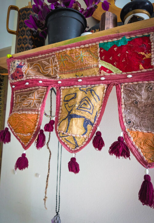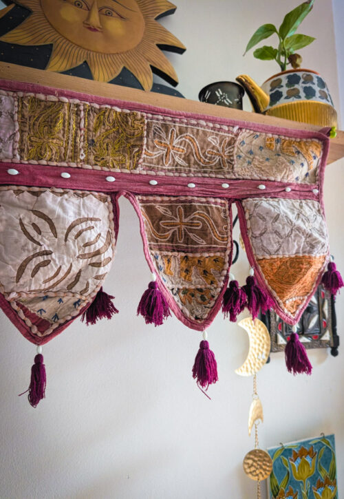 Beautiful Indian embroidered toran in a soft red with appliqué and embroidery. Torans are traditionally hung over doorframes to welcome the goddess Lakshmi, though are also beautiful pinned on to a shelf or above a bed. One section has missing appliqué, reflected in price Material: Cotton Size: 37 x 11" / 86 x 27.5cm Please note although we do our best to check, all preloved and vintage may show little signs of wear. -