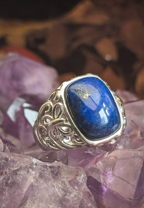This is a one-off preloved piece and can't be restocked Gorgeous statement silver ring. A raised piece of smooth lapis lazuli gemstone, set with butterflies and spiral detailing. A shiny and whimsical piece! Material: Silver, stamped 925 and has a maker's mark Size: UK R / US 8.75 / EU 59 Weight: 9g We recommend that all jewellery, no matter what its content, is kept away from water and chemicals and stored in a jewellery box to prevent tarnish and prolong its beauty. -