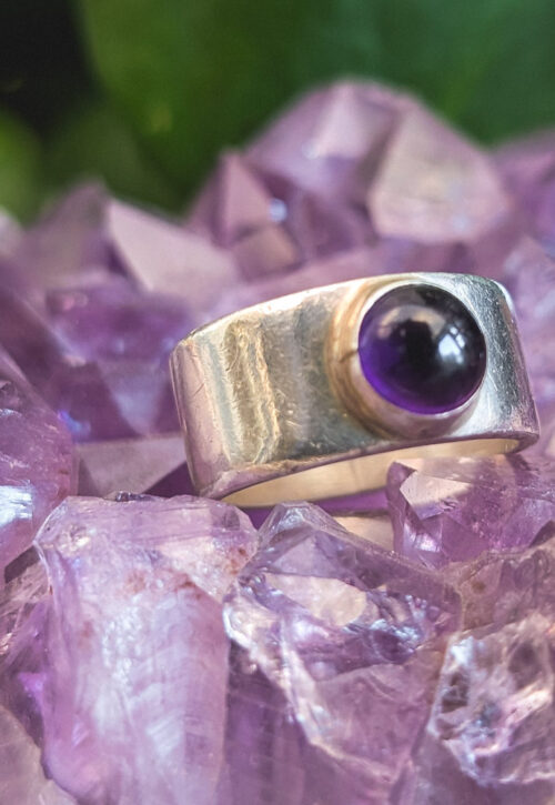 This is a one-off preloved piece and can't be restocked Solid, chunky ring with a piece of dark cabochon amethyst in the centre. In good condition with a little tarnish on the back. Material: Silver, stamped 925 and Mexico Size: UK U / US 10.25 / EU 62.75 Weight: 14g We recommend that all jewellery, no matter what its content, is kept away from water and chemicals and stored in a jewellery box to prevent tarnish and prolong its beauty. -