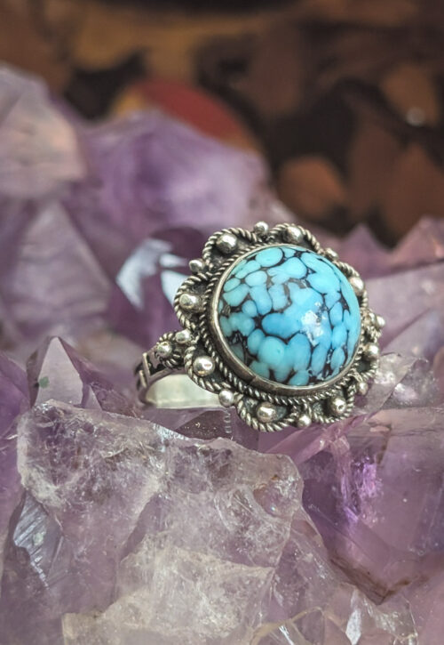 Absolutely stunning one of a kind this Indian silver ring will adorn any finger resulting in the most amazing look. A deep set piece of rough gemstone with a rope surround and solid band. Although vintage items may have some signs of wear this is in excellent condition with some patina that can be easily polished off (buyers prerogative). This is a dream of a boho piece of jewellery to be enjoyed for years to come. Size: UK N / US 6.75 / EU 54.5 Material: 925 silver (not hallmarked), gemstone Adorned recommend that all jewellery no matter what it's content is kept away from water and chemicals and stored in a jewellery box to prolong the beauty.