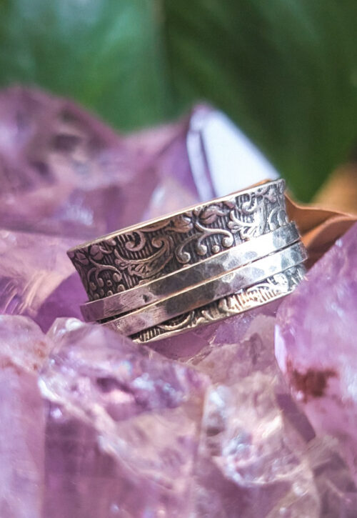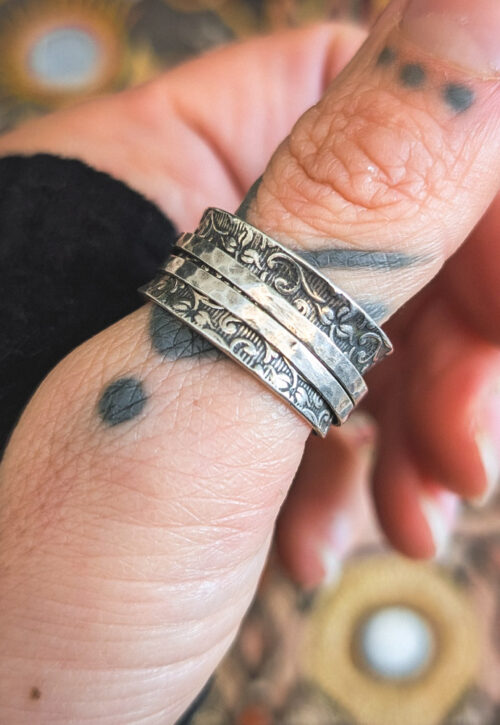 This is a one-off preloved piece and can't be restocked Funky spinner ring with a concave design, floral oxidised background with two thin hammered spinning bands. Material: Silver, stamped 925 Size: UK R / US 8.75 / EU 59.5 Weight: 5g We recommend that all jewellery, no matter what its content, is kept away from water and chemicals and stored in a jewellery box to prevent tarnish and prolong its beauty. -