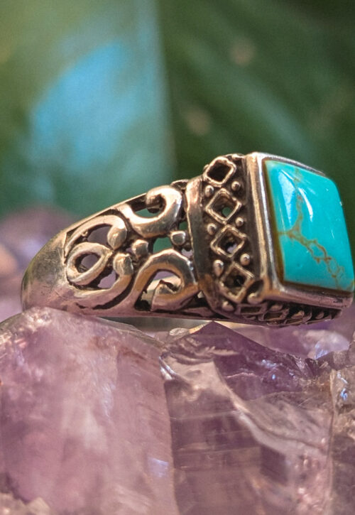 This is a one-off preloved piece and can't be restocked Blue faux-turquoise style Peking glass set in a floral mount with granulation detail and a gorgeous Greek key band. Material: Silver, stamped 925 Size: UK Q / US 8 / EU 59 Weight: 5g We recommend that all jewellery, no matter what its content, is kept away from water and chemicals and stored in a jewellery box to prevent tarnish and prolong its beauty. -