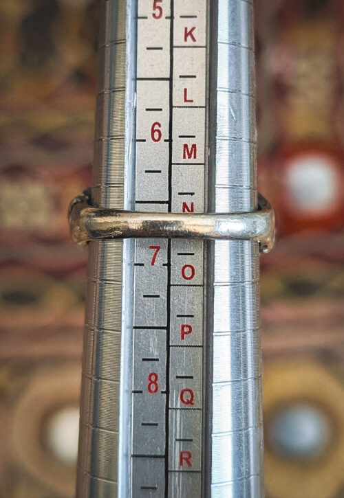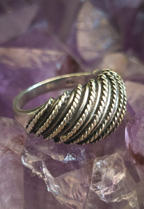 This is a one-off preloved piece and can't be restocked Bohemian ring with a concave front inlaid with diagonal twisted stripes and oxidised detail. Material: Silver, stamped silver Size: UK N / US 6.75 / EU 53.5 Weight: 7g We recommend that all jewellery, no matter what its content, is kept away from water and chemicals and stored in a jewellery box to prevent tarnish and prolong its beauty. -