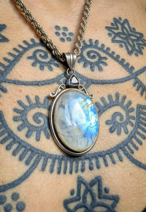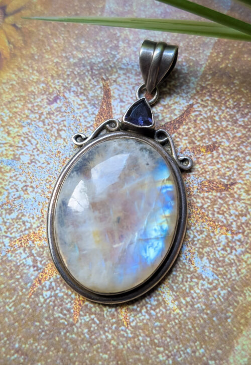 This is a one-off preloved piece and can't be restocked Beautiful polished rainbow moonstone pendant set with a small piece of faceted purple amethyst crystal and swirl detail. Chain not included but available separately. In very good condition with some light surface marks. Material: Silver, stamped 925 Size: 2.25" / 5.5cm including bale Weight: 17g We recommend that all jewellery, no matter what its content, is kept away from water and chemicals and stored in a jewellery box to prevent tarnish and prolong its beauty. -