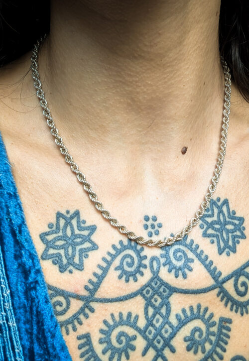 This is a one-off preloved piece and can't be restocked Classic silver twisted rope chain with a slight oxidised finish, ideal for wearing on its own, layered up or with a pendant as shown. Pendant and matching bracelet available separately. Material: Silver, stamped 925 plus makers marks Size: 18" / 46cm Weight: 9g We recommend that all jewellery, no matter what its content, is kept away from water and chemicals and stored in a jewellery box to prevent tarnish and prolong its beauty. -