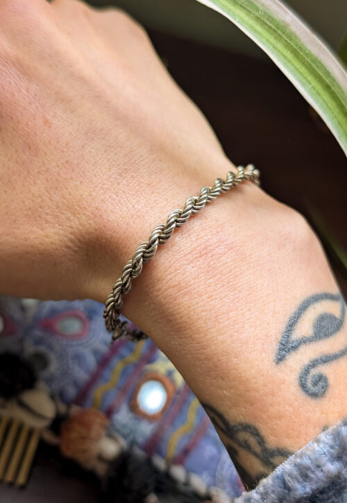 This is a one-off preloved piece and can't be restocked Classic silver twisted rope chain with a slight oxidised finish, ideal for wearing on its own or layering as part of your silver stack. Machine necklace available separately. Material: Silver, stamped 925 Size: 7" / 17.5cm Weight: 9g We recommend that all jewellery, no matter what its content, is kept away from water and chemicals and stored in a jewellery box to prevent tarnish and prolong its beauty.