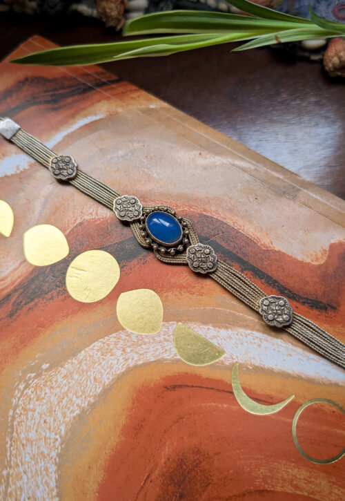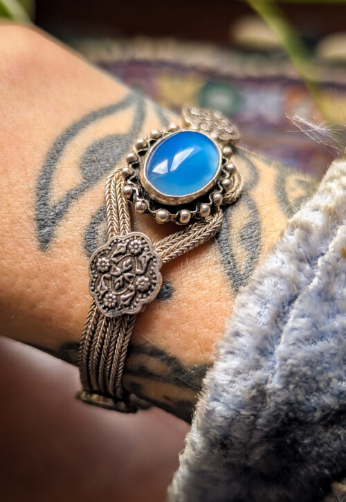 This is a one-off preloved piece and can't be restocked Ornate vintage silver bracelet. Consisting of multiple strands of a fine, herringbone silver weave which are interspersed with floral raised buttons, winding their way around a centerpiece of blue polished gemstone with granulation detail. Finished with chunky, solid ends and a lobster clasp. This is in good condition with light surface wear and a patina, which we think adds a bohemian charm. Material: Silver, stamped 925 Size: 7.25" / 18cm long, .75" / 2cm at widest point Weight: 21g We recommend that all jewellery, no matter what its content, is kept away from water and chemicals and stored in a jewellery box to prevent tarnish and prolong its beauty. -
