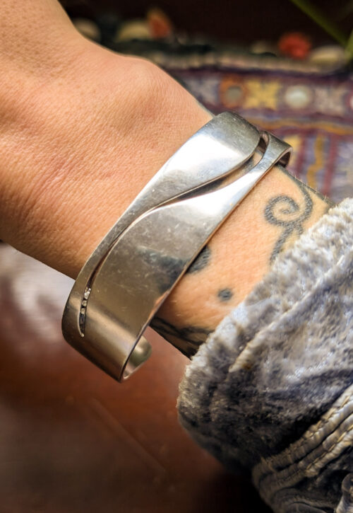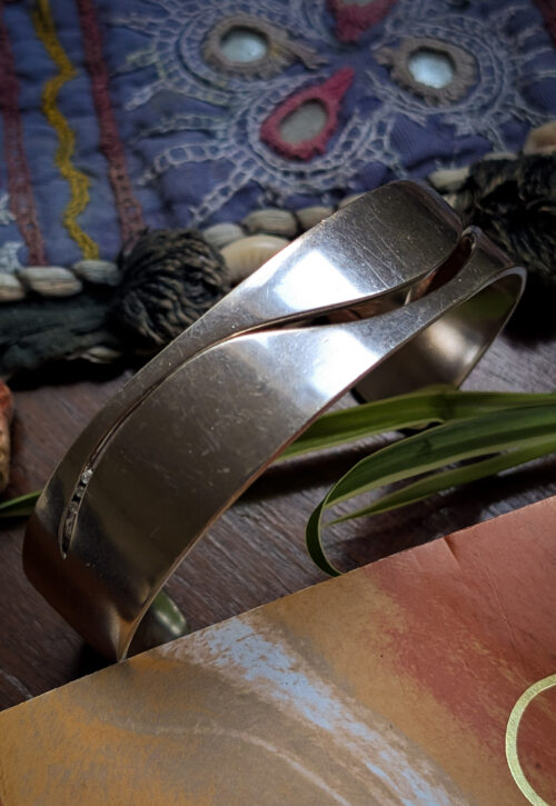This is a one-off preloved piece and can't be restocked This is a classic, everyday piece for a silver lover. Clocking in at an incredible 48g, this is a solid and wearable bangle with wave-like cut-out detail and three tiny diamantes. Ideal as part of a stack or for those who like a simple, contemporary piece. In good condition with light surface marks. A piece like this will only retain its value if not increase, as the price of silver is currently shooting up. This is slightly adjustable however we kindly ask to please not adjust it unless you are completely happy to keep it, as this may change the shape and void a return. Material: Silver, stamped 925 and makers marks Size: 2.5 x 2" / 6.2 x 5cm inner diameter, 1.1" / 17mm wide Weight: 48g We recommend that all jewellery, no matter what its content, is kept away from water and chemicals and stored in a jewellery box to prevent tarnish and prolong its beauty. -