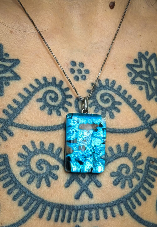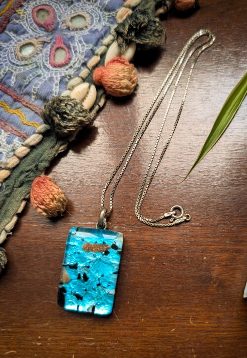 This is a one-off preloved piece and can't be restocked Pretty, mystical dichoric glass in a dreamy Mediterranean blue with flecks of black and copper. Set on a fine box chain which is stamped 925. Material: Silver, stamped 925 Size: 18" / 46cm + 1.5" / 3.8cm pendant Weight: 13g We recommend that all jewellery, no matter what its content, is kept away from water and chemicals and stored in a jewellery box to prevent tarnish and prolong its beauty. -