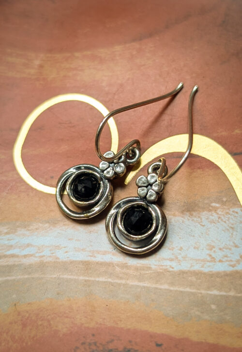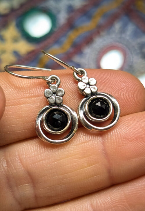 This is a one-off preloved piece and can't be restocked A pair of delicate circle and flower earrings with a big hook. Centrepiece of magical sparkling black onyx crystals Material: Silver, stamped 925 Size: .5" / 1.6cm excluding hooks Weight: 1g We recommend that all jewellery, no matter what its content, is kept away from water and chemicals and stored in a jewellery box to prevent tarnish and prolong its beauty. -