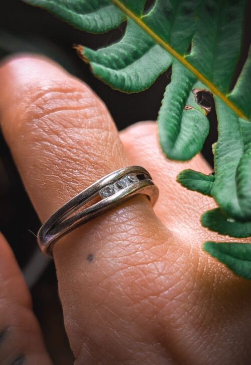 This is a one-off preloved piece and can't be restocked Simple contemporary silver ring in a gentle wave shape with little diamante crystals. In good preloved condition with light surface marks. Material: Silver, stamped 925 + makers marks Size: UK T / US 9.75 / EU 62 Weight: 5g We recommend that all jewellery, no matter what its content, is kept away from water and chemicals and stored in a jewellery box to prevent tarnish and prolong its beauty. -