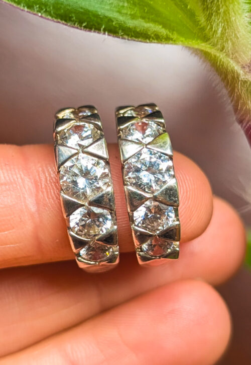 This is a one-off preloved piece and can't be restocked Classic silver hoops set with sparkling crystals. Secure lever fastening across the top. Perfect everyday piece. Material: Silver, stamped 925 Size: .6" / 1.4cm across Weight: 3g for the pair We recommend that all jewellery, no matter what its content, is kept away from water and chemicals and stored in a jewellery box to prevent tarnish and prolong its beauty. -