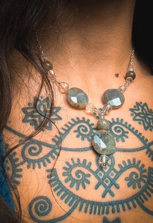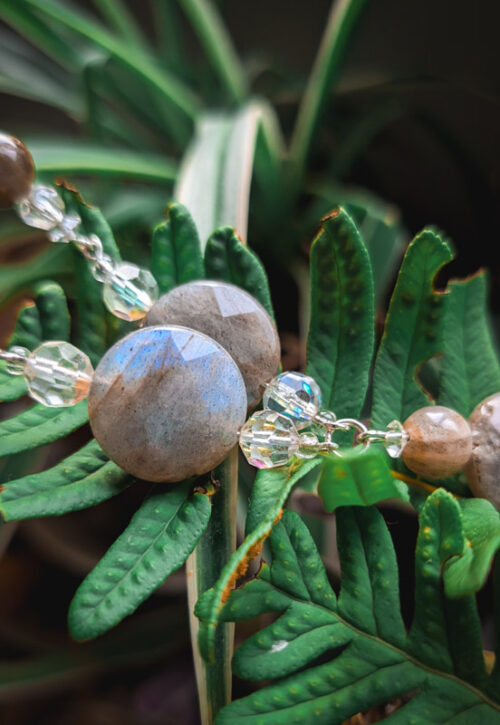 This is a limited edition line necklace made with vintage beads. A beautiful necklace with a contemporary, bohmiean feel. Made by Mamma, it features recycled faceted and round, polished labradorite crystals. Set with yet more vintage AB crystal which sparkles in the light. Silver plated chain, clasp to fasten and an extender. Approx 60% recycled. Only two of these made. Materials: Silver tone costume metal, gemstone Size: 16-18" / 40-45cm plus a 1.75"/4.5cm drop -