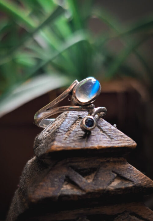 This is a one-off preloved piece and can't be restocked Simple silver ring with a polished piece of moonstone and a smaller blue crystal. In good preloved condition with light surface marks. Material: Silver, stamped 925 Size: UK O / US 7.25 / EU 55 Weight: 3g We recommend that all jewellery, no matter what its content, is kept away from water and chemicals and stored in a jewellery box to prevent tarnish and prolong its beauty. -