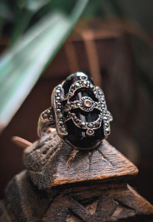 This is a one-off preloved piece and can't be restocked Beautiful vintage ring with a large piece of polished onyx with a shield of silver detailing over the top. Set with tiny metallic grey marcasite stones, this is an old piece. Only the centre stone is missing which doesn't impact wearability. This has always been picked up the most at our markets as it's so pretty, it's just waiting for the perfect tiny finger! Material: Silver, stamped 925 Size: UK J / US 4.75 / EU 49 Weight: 10g We recommend that all jewellery, no matter what its content, is kept away from water and chemicals and stored in a jewellery box to prevent tarnish and prolong its beauty. -