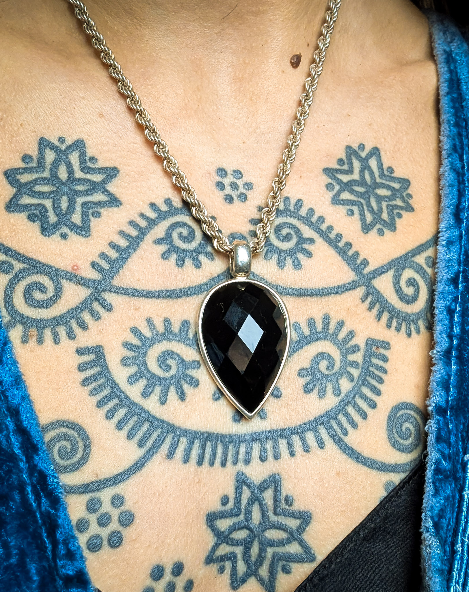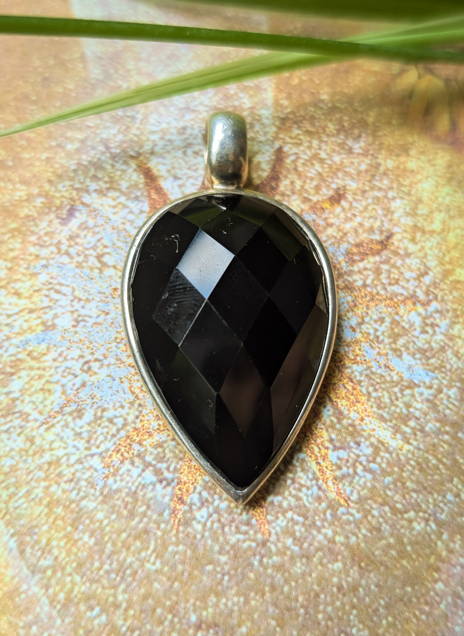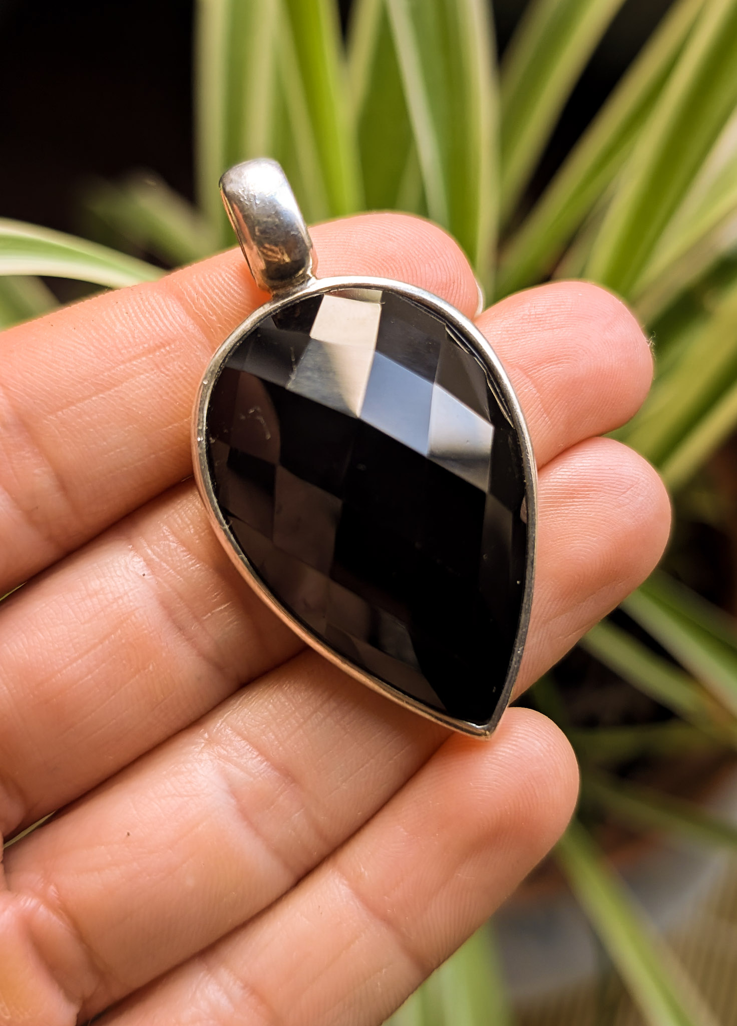 Eye-catching faceted black onyx crystal pendant. A beautiful pointed teardrop shape set in a simple band of silver with a large bale for threading onto a chain or cord. Chain is not included but available separately.