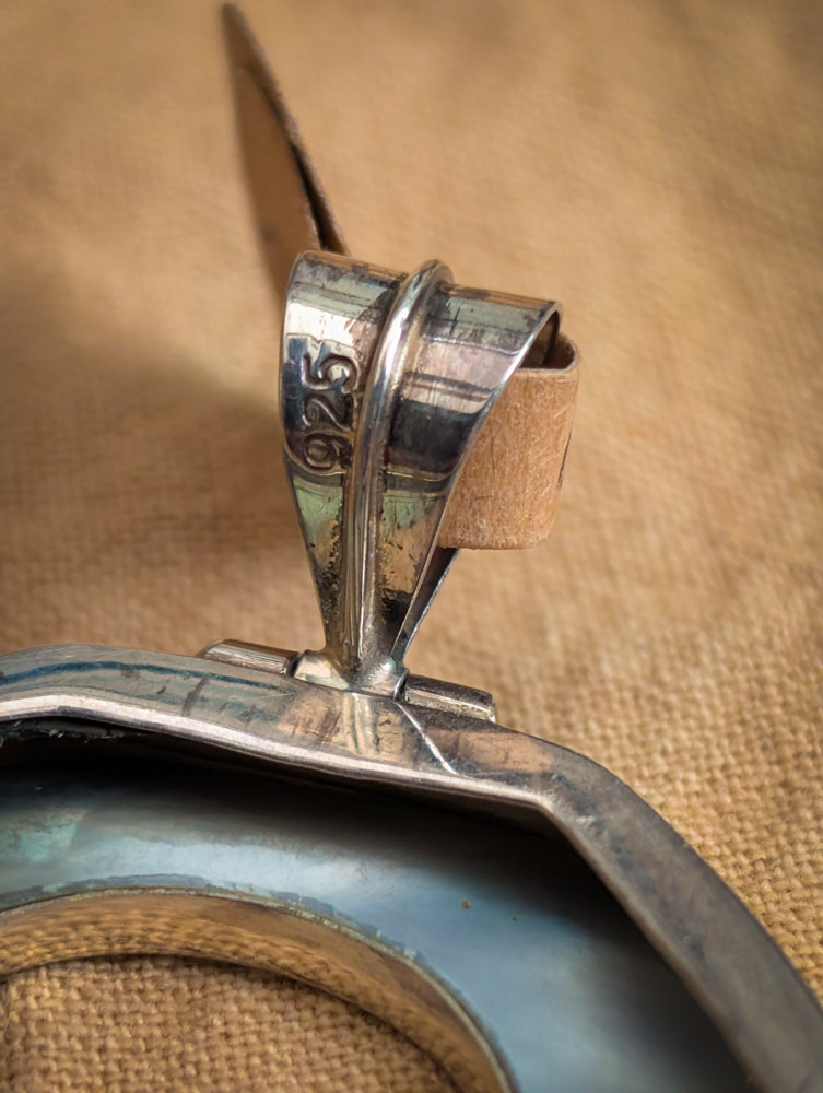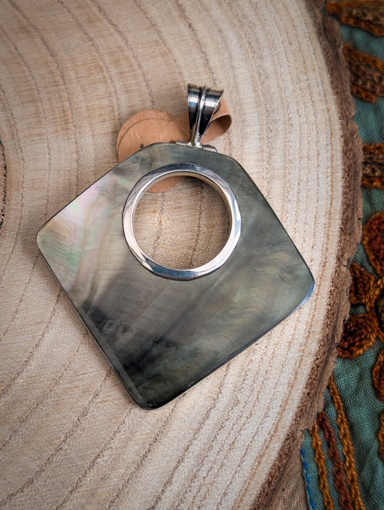 Modern silver pendant in a square shape, with rounded corners and a circle cut out. Gorgeous deep grey shell.