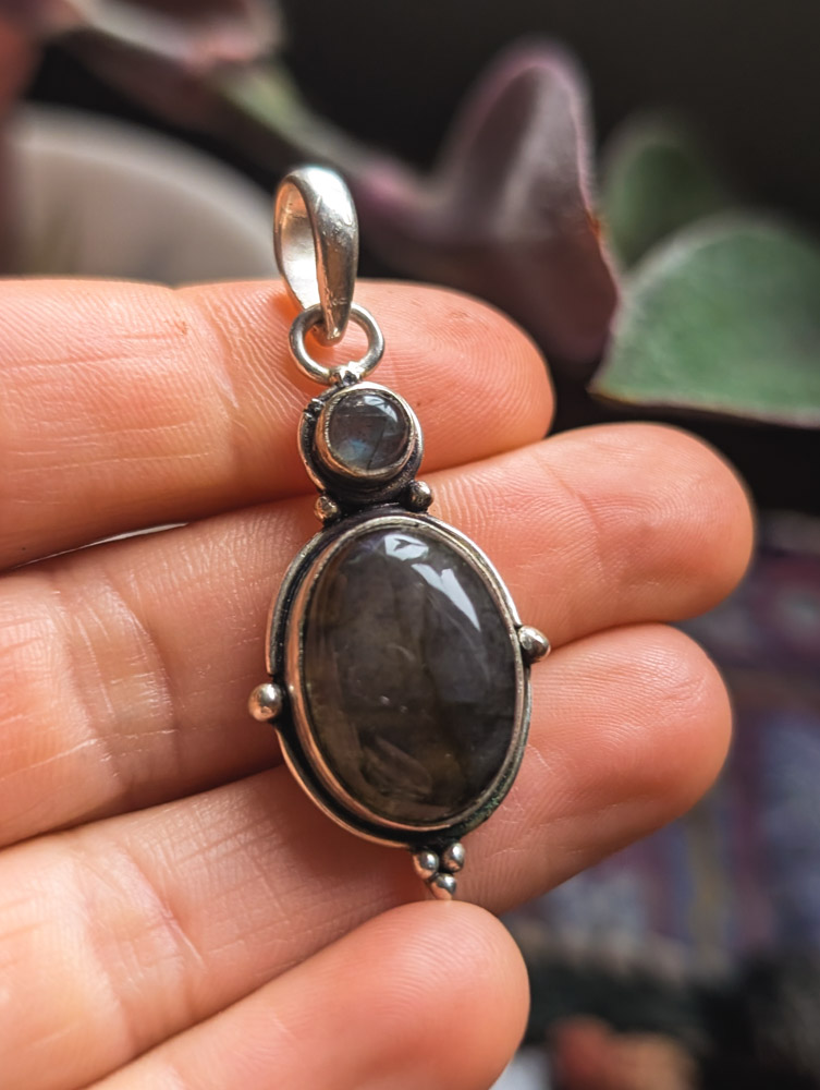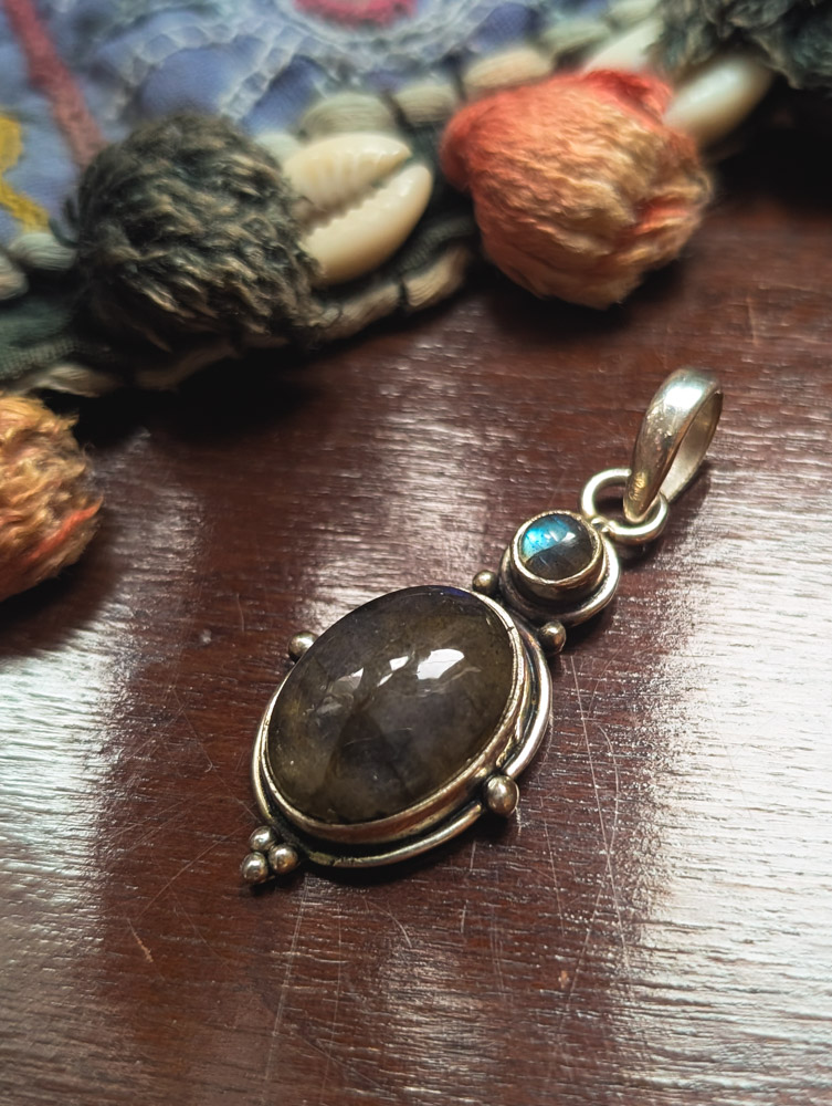 Adorable pendant with two pieces of smooth, polished labradorite (one of our favourites!) With a thick silver mount and dotted detail.Chain is not included but we have some available on our shop.