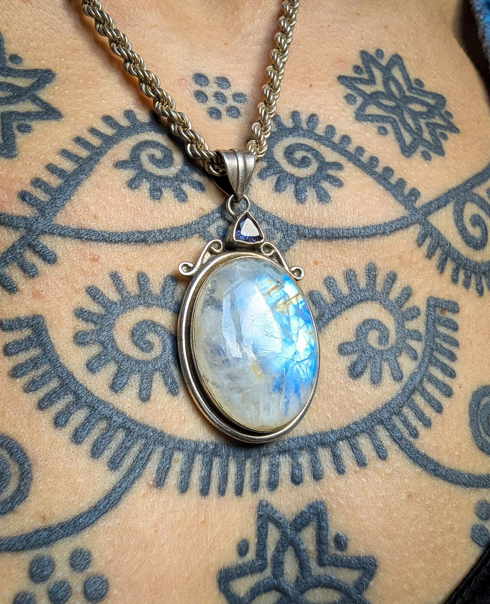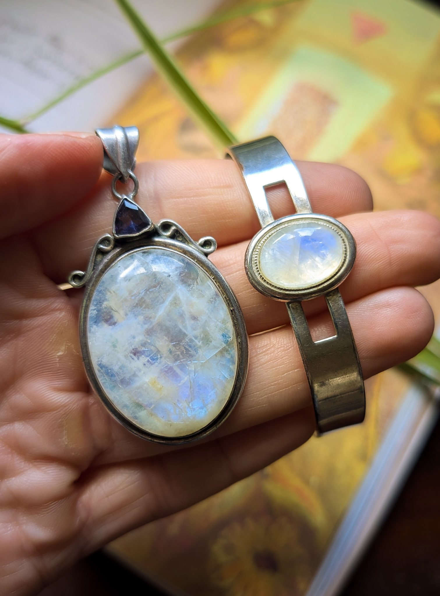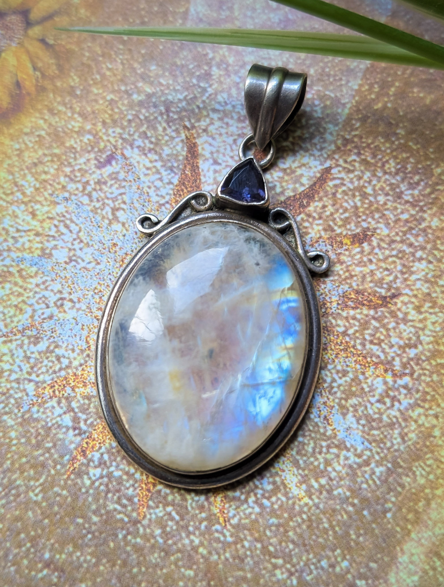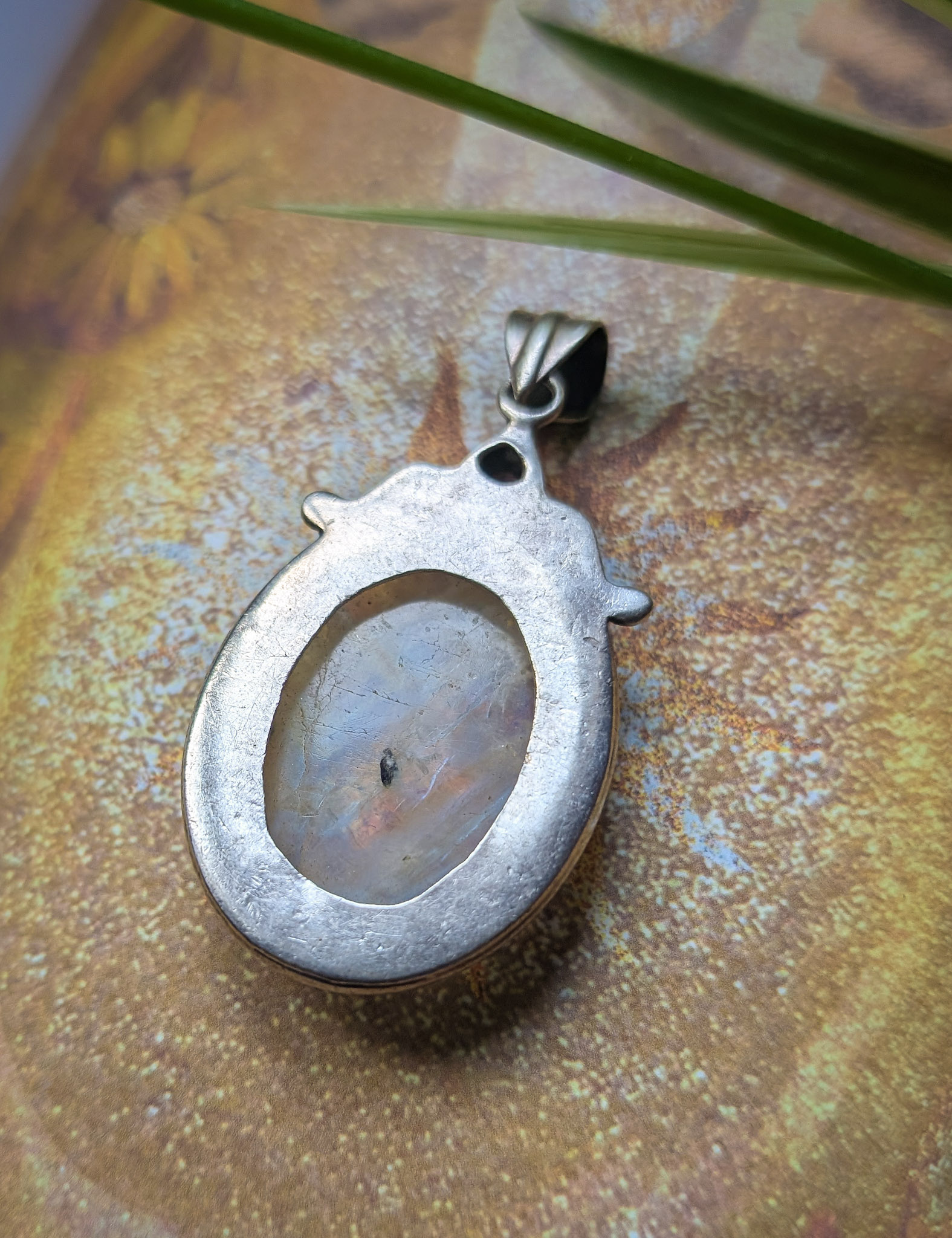 Beautiful polished rainbow moonstone pendant set with a small piece of faceted purple amethyst crystal and swirl detail. Chain not included but available separately. In very good condition with some light surface marks.