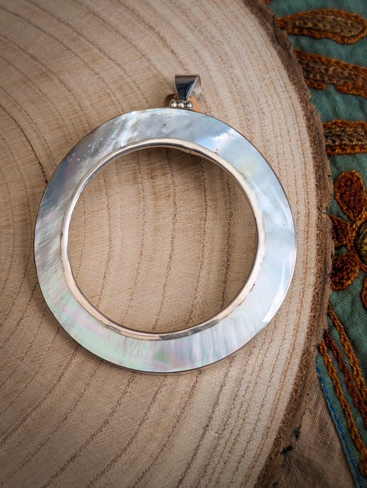 Large, lightweight silver pendant in a convex circle shape set with wonderful shimmering shell.