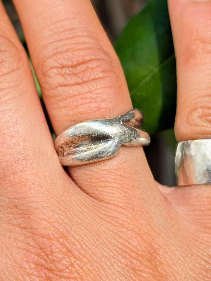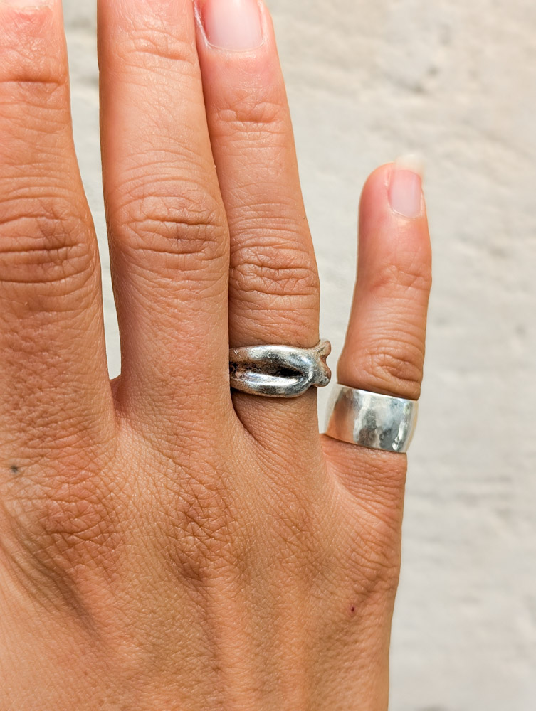 Silver ring with a twisted shape, has a nice solid look to it on and tapers off to a thinner band at the back. Very contemporary and fits in with any silver lover’s collection.