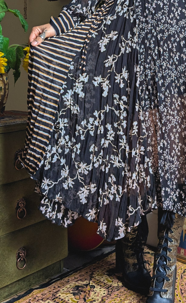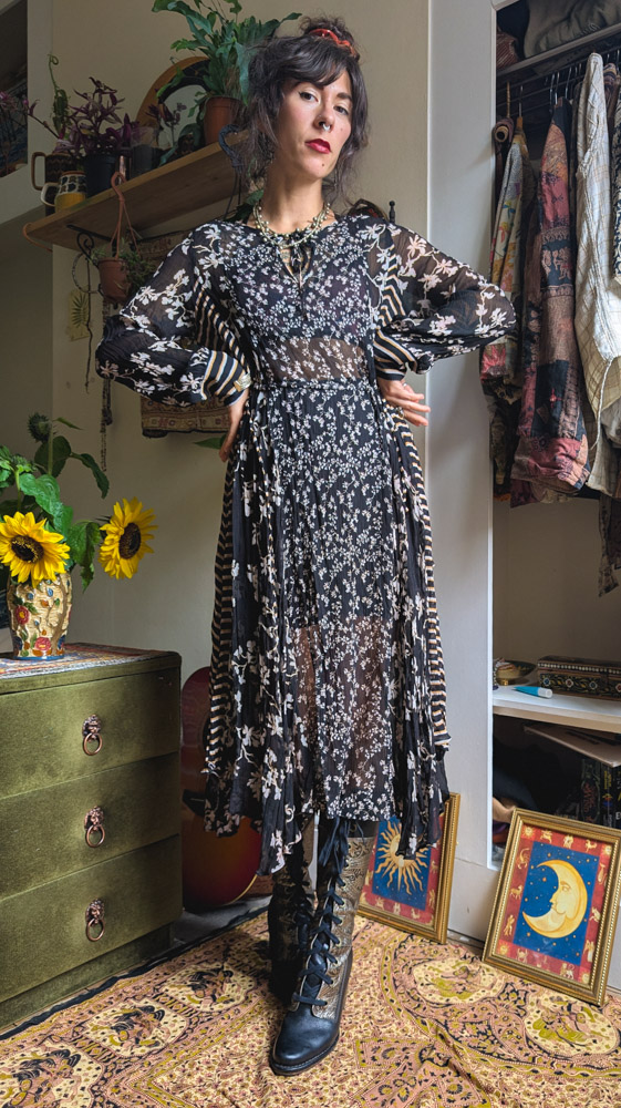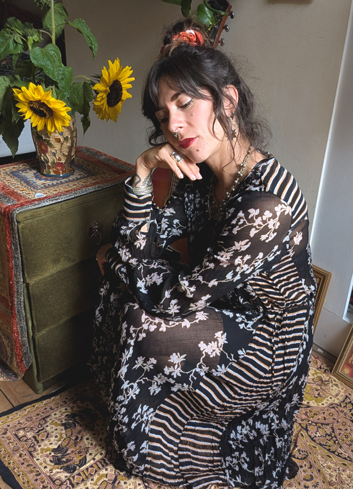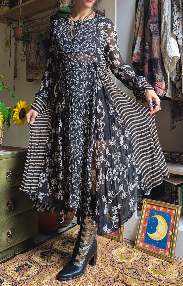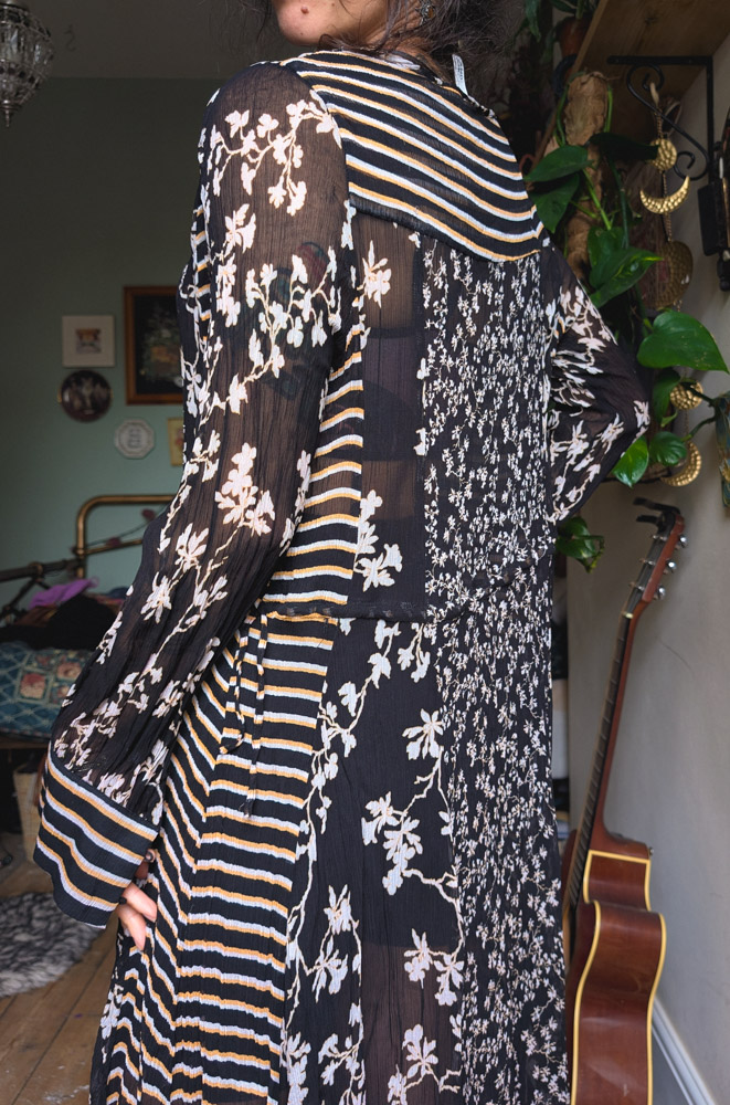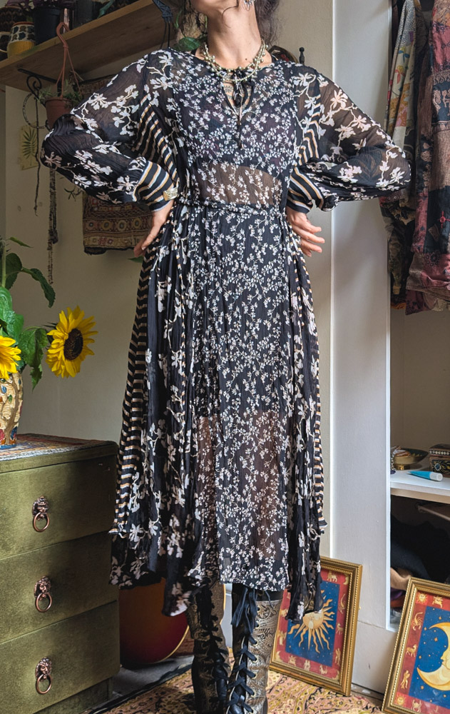 Gorgeous sheer dress from fancy brand And/Or (RRP £200+). Black with contrasting sections of a floral pattern and stripe. Crinkly, bohemian fabric. Relaxed, slightly oversize fit in the body and more fitted on the sleeves. We have laundered this so it’s fresh and ready to wear.