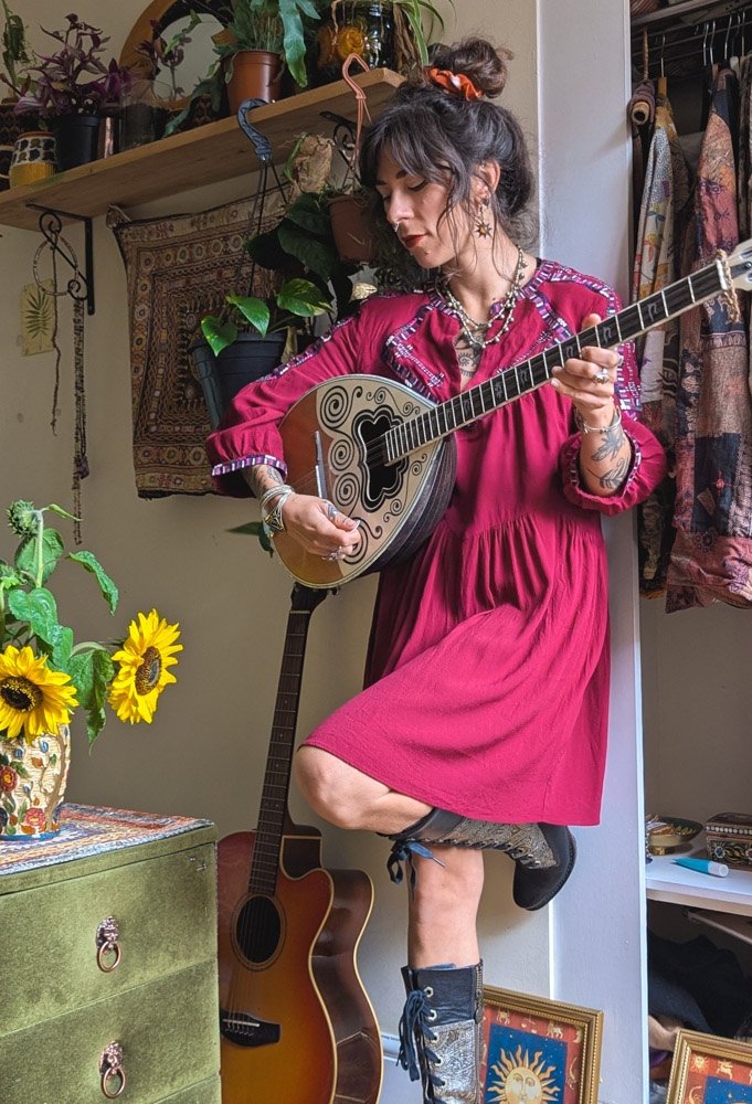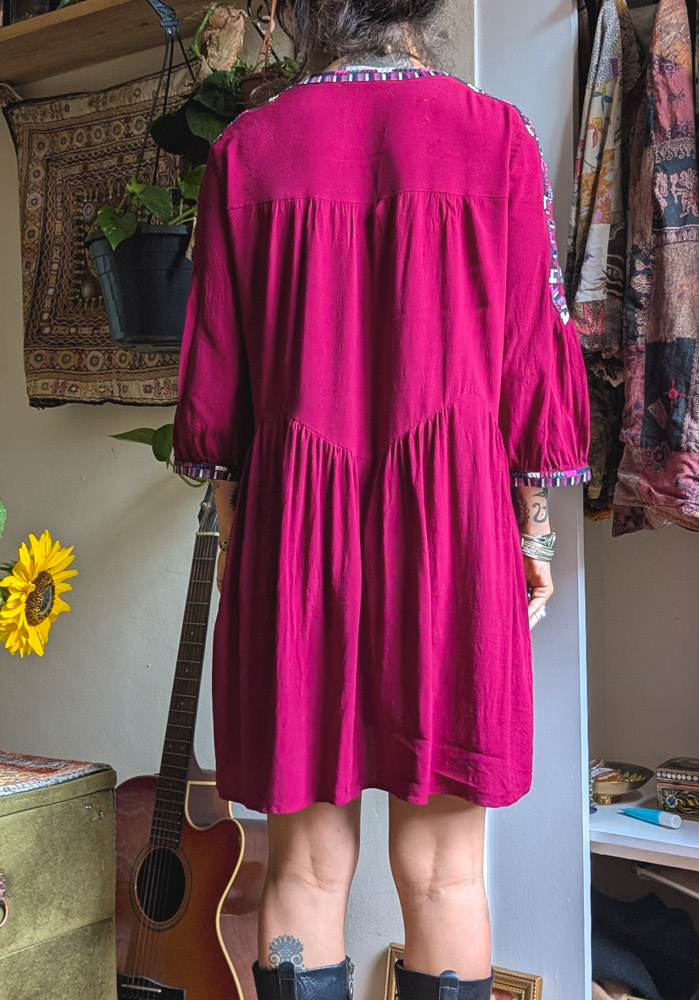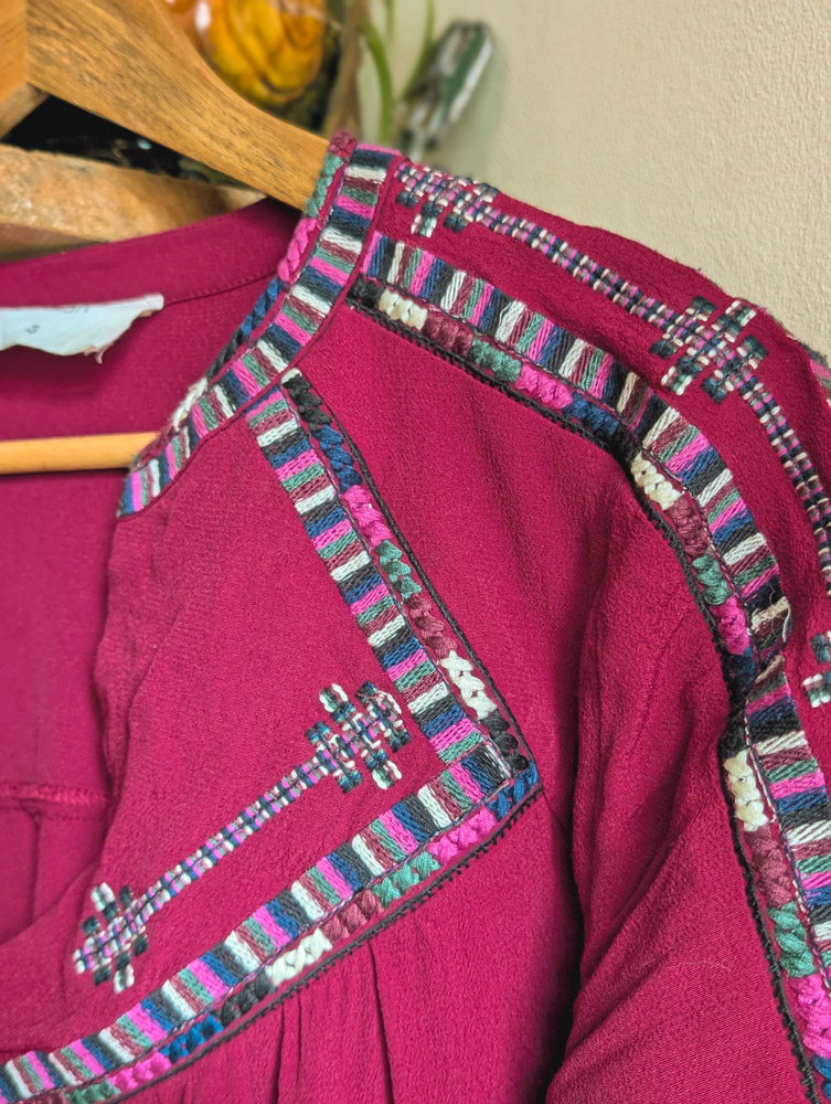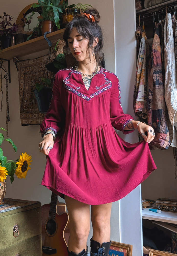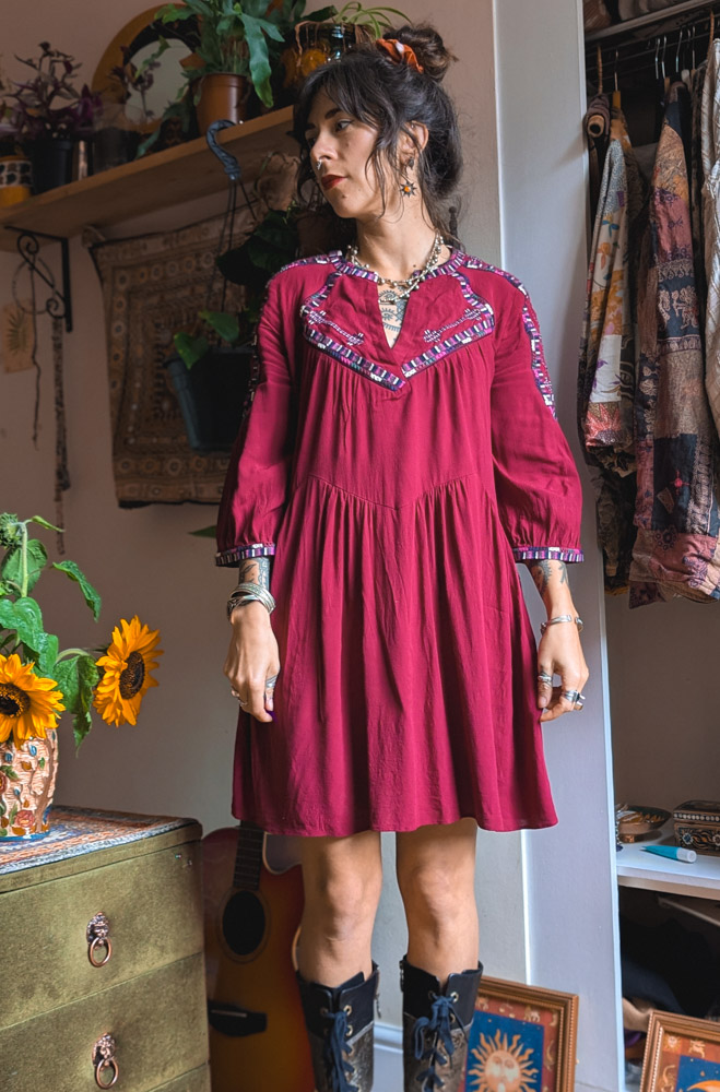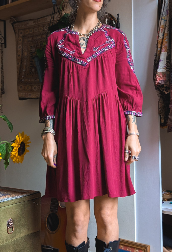 Cute autumnal folk dress from fancy brand Ba&ash (RRP €200+). Rich burgundy with multicoloured embroidery around the yoke and sleeves. Relaxed, swingy fit with a shallow v-neck. We have laundered this so it’s fresh and ready to wear.