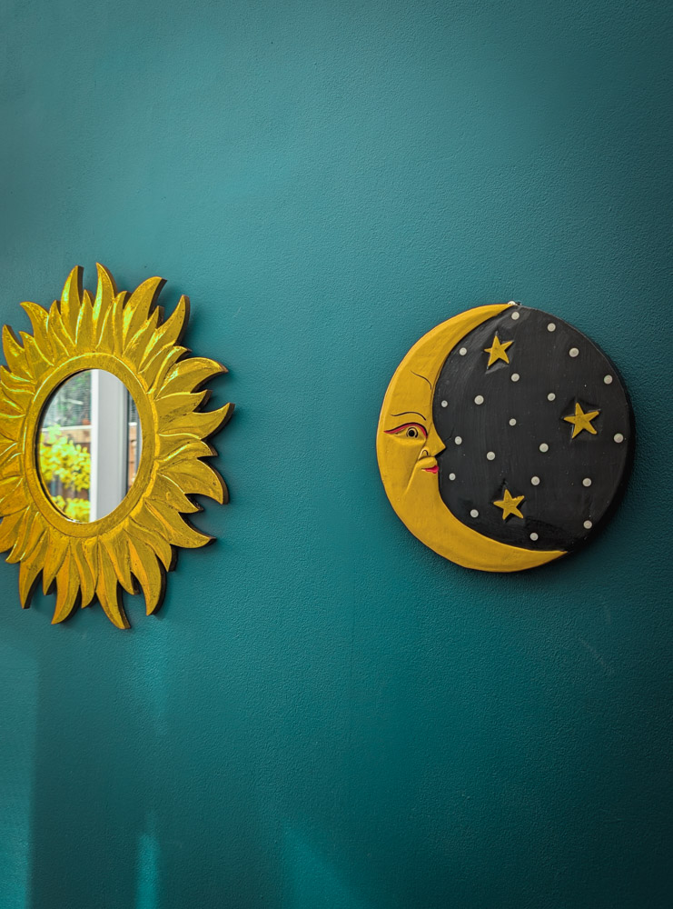 Beautiful essential for any bohemian or hippie home. A lightweight, wooden round plaque with a relief of a sun. It’s definitely got a 90s feel about it which we adore. The gold and black is a classic combination yet the metallic isn’t brassy, it’s nice and soft.