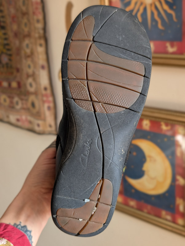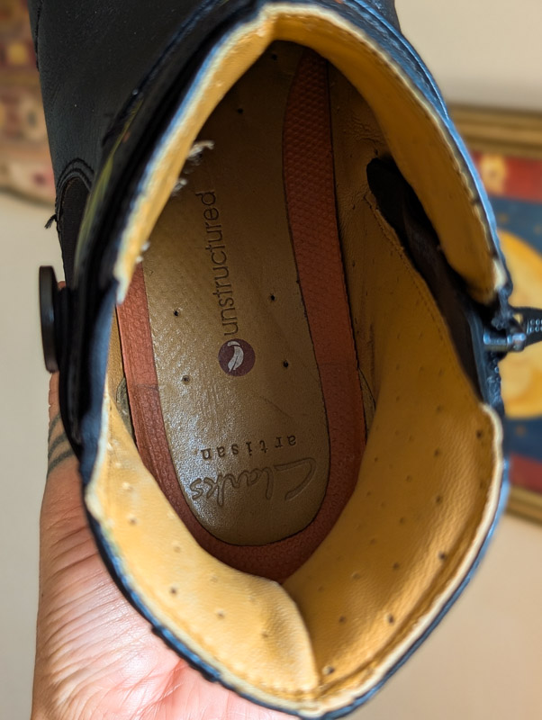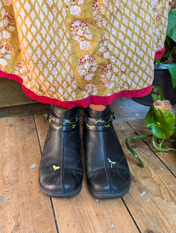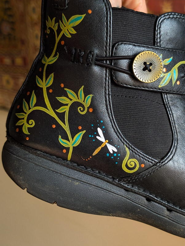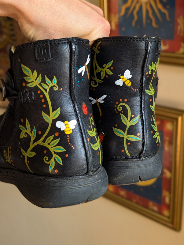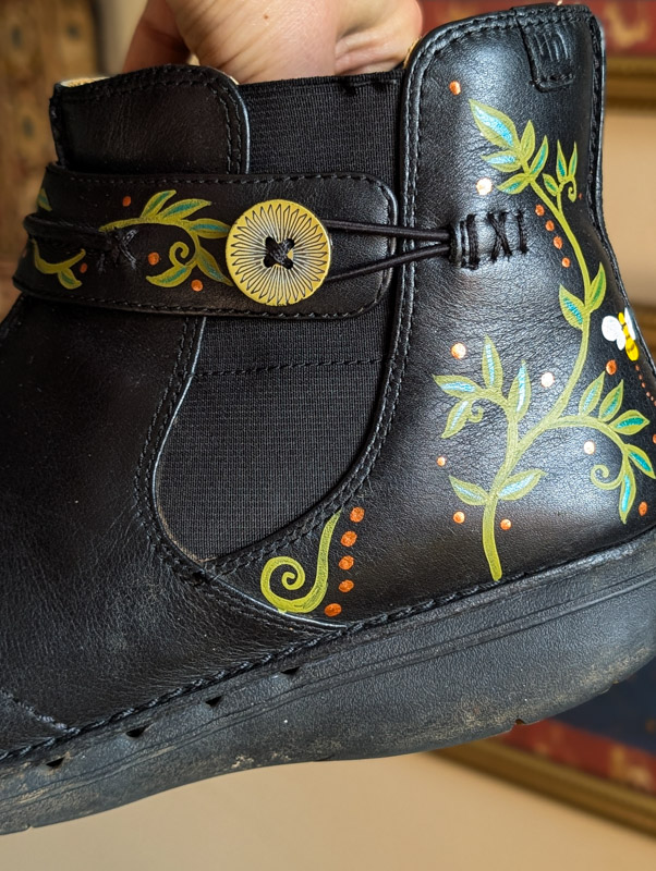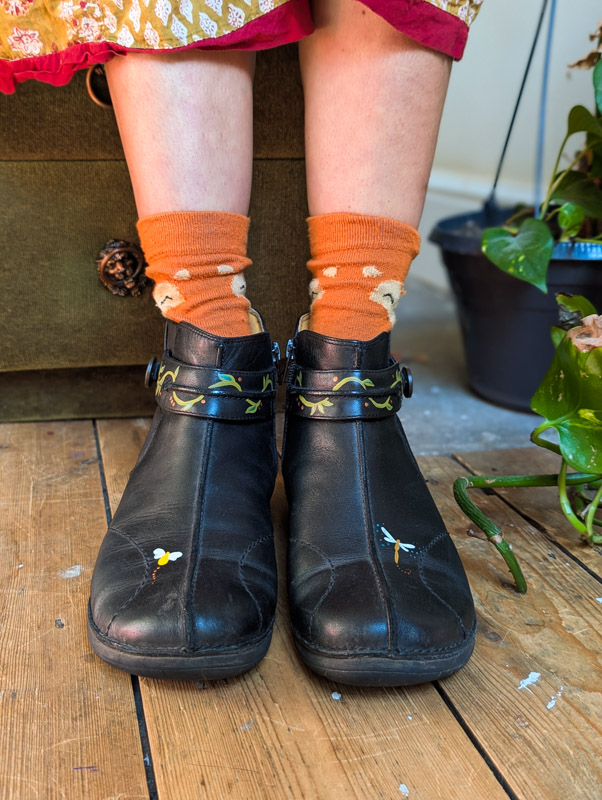 Preloved black leather boots by Clarks (RRP £90) with zip-up the side, comfy fit and barely used condition. These have been transformed by us into a fairytale of little critters and swirling vines all over. The paint will remain on these as long as they don’t get scuffed.