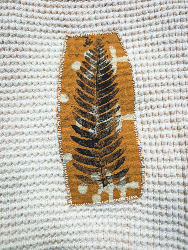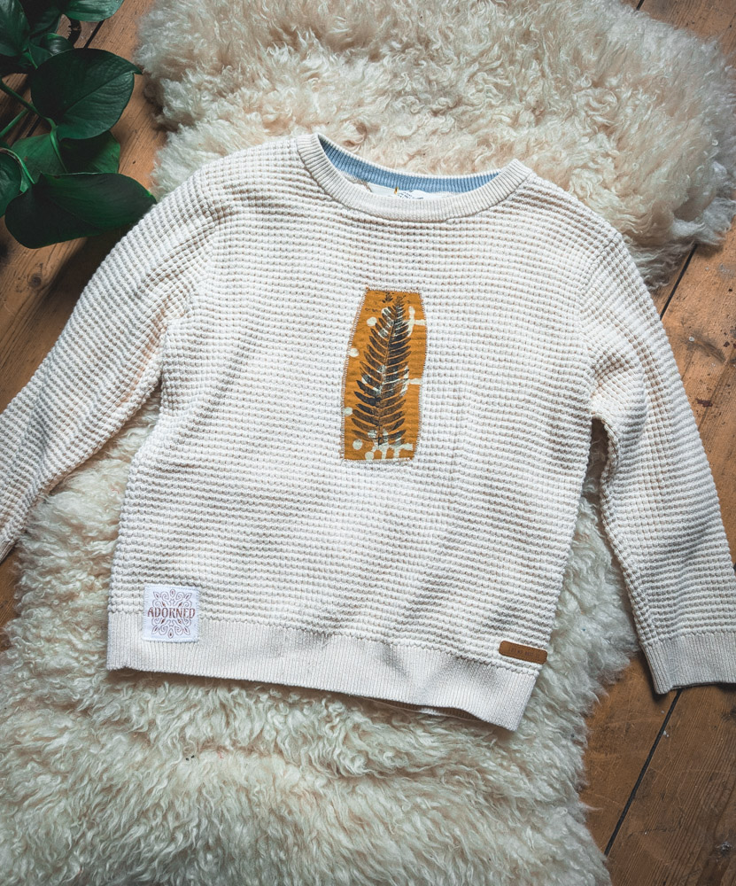 Preloved off-white waffle texture jumper, reworked with a fern patch printed on eco-friendly fabric. Machine washable at 30C or less following simple care instructions.