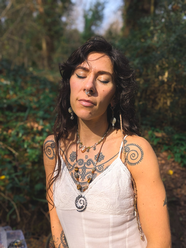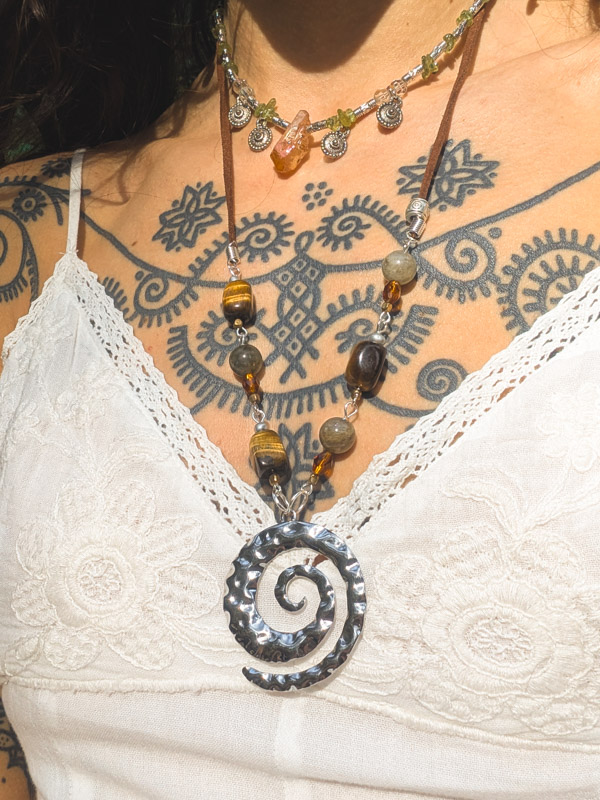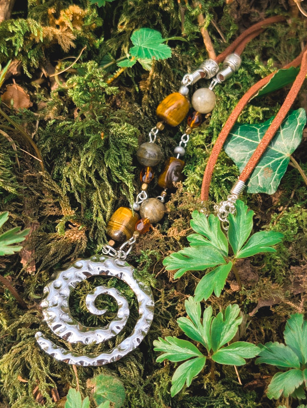 Hammered gold spiral necklace. Designed and made by Sarah with recycled tiger’s eye, polished labradorite and faceted vintage amber coloured glass for an earthy finish. Set on sparkly faux suede (which we’ve had for over 10 years) with silver plated findings and an extender. Approx 50% recycled.