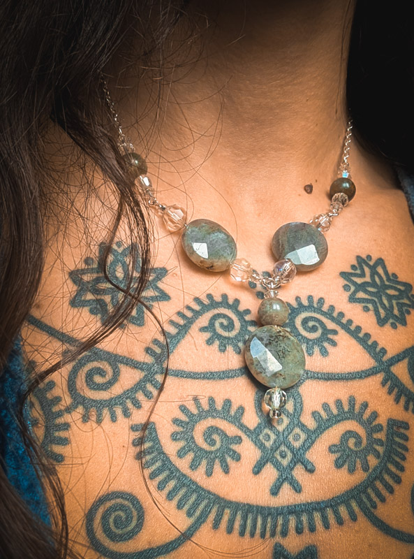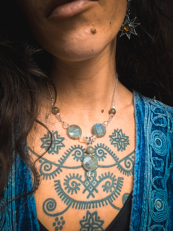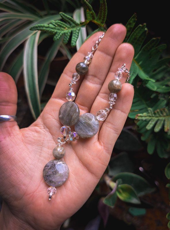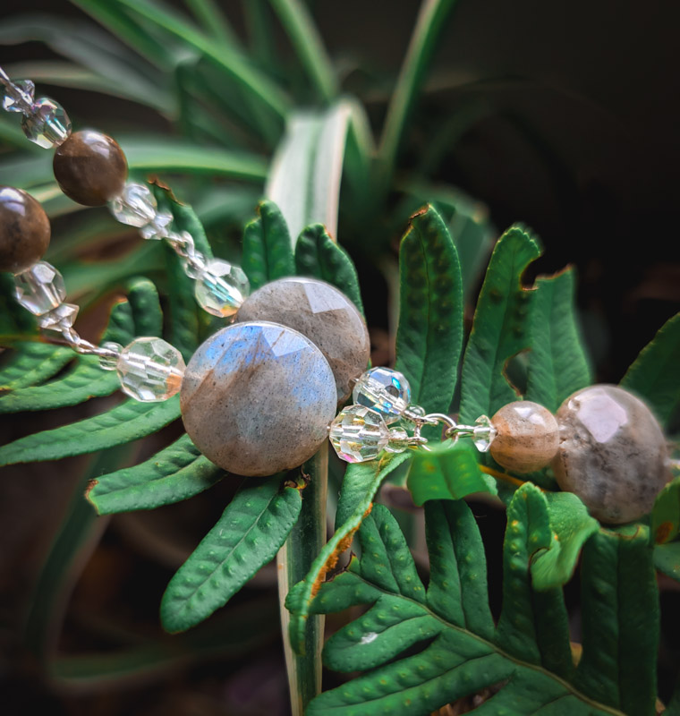 A beautiful necklace with a contemporary, bohmiean feel. Made by Mamma, it features recycled faceted and round, polished labradorite crystals. Set with yet more vintage AB crystal which sparkles in the light. Silver plated chain, clasp to fasten and an extender. Approx 60% recycled. Only two of these made.