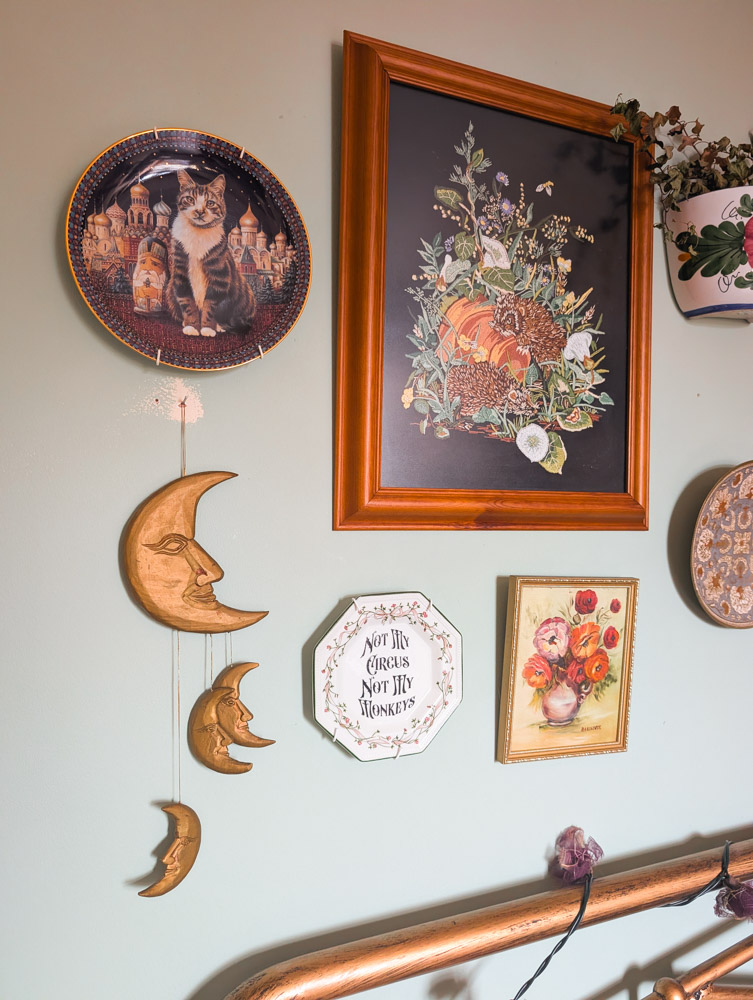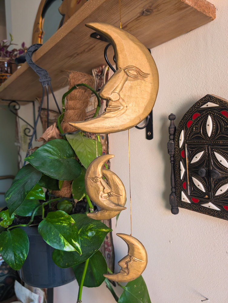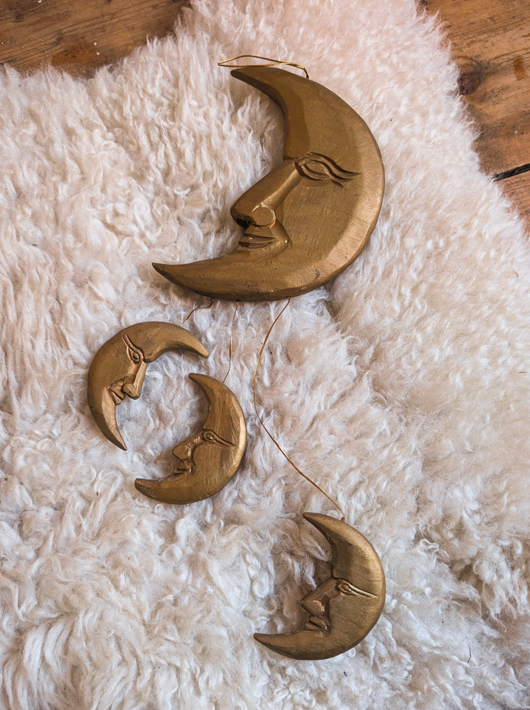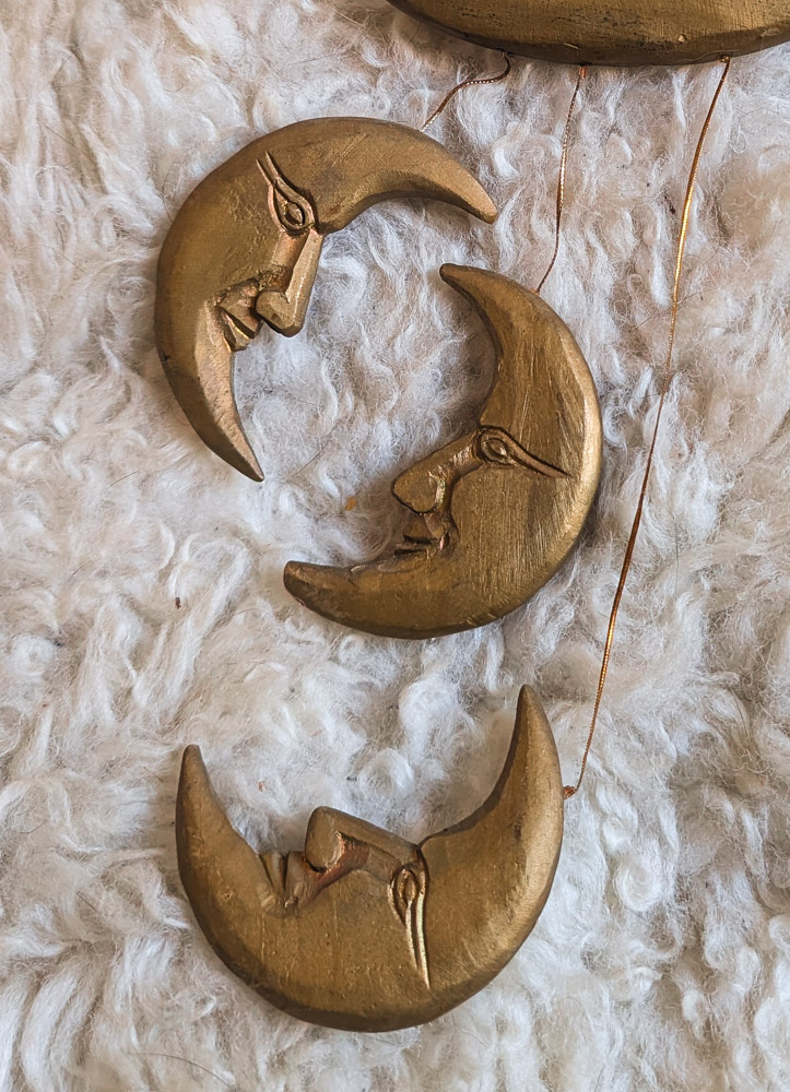 Cheery carved wooden moon mobile which shimmers metallic gold / copper.