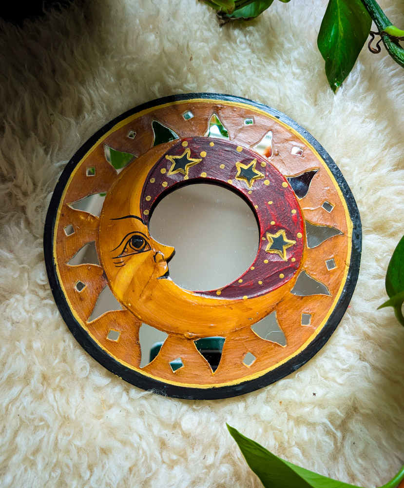 A gorgeous decorative mirror with the ever-popular moon design. Painted in rich earthy tones, this piece of wall art features a rustic, distressed style with delicately cut mirrored pieces. Ideal boho room or dorm decor with a 90s feel.